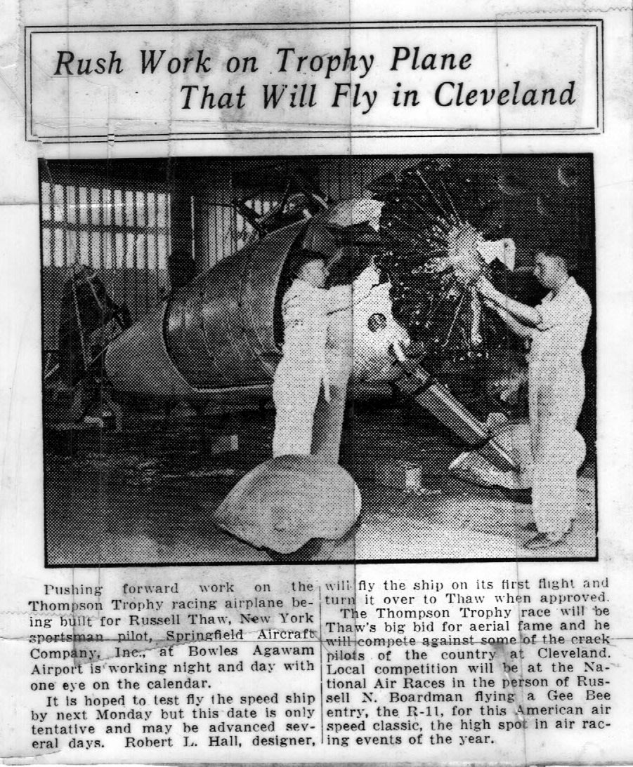 Robert Hall is building a racing plane for the Thompson Trophy event. Russell Thaw, a 21-year-old transport pilot backed by the Guggenheim family, will fly the plane. This will be the first racing plane built by Springfield Aircraft after Hall's split from Granville Brothers, with first test flights planned for August 20.