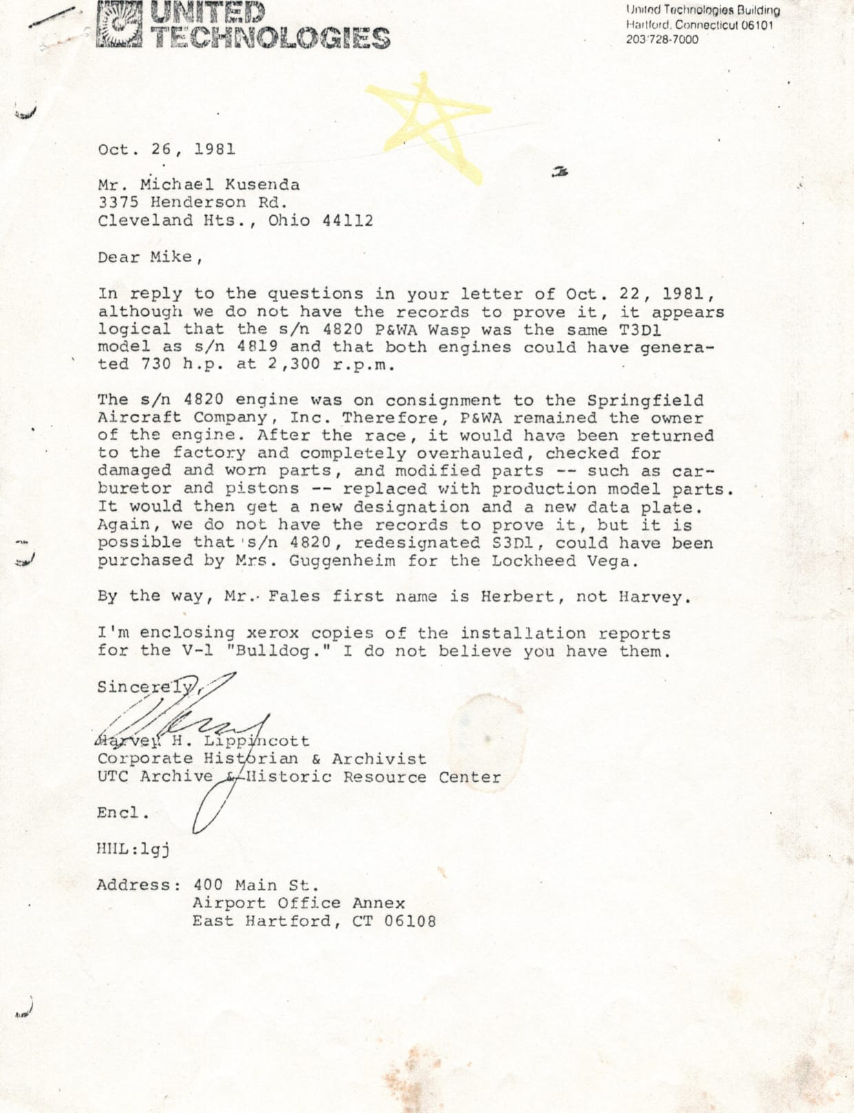 Explore the Project →In October 1981, aviation historian Michael Kusenda of Cleveland Heights, Ohio wrote to Pratt & Whitney seeking information about the engine used in the Hall Bulldog. The response from Harvey H. Lippincott, Corporate Historian & Archivist at United Technologies, included xerox copies of the original 1932 installation reports—documents that provide invaluable technical details about this remarkable racing aircraft.
