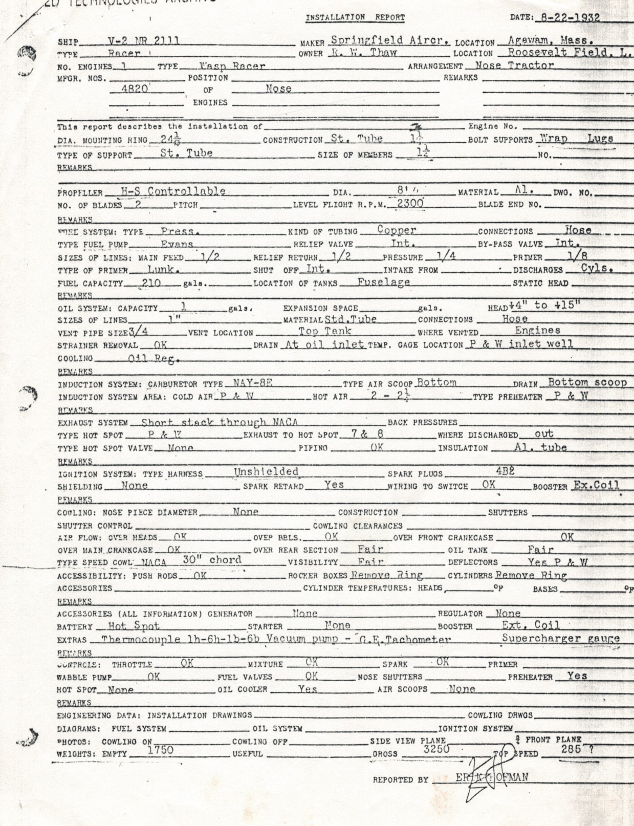 The following pages are the original Pratt & Whitney installation reports from 1932: