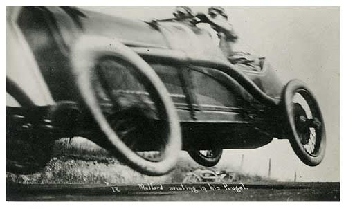 Rolling shutter distortion in a period photograph. Note the oval wheels and forward lean—a stylistic effect later adopted by animators to convey speed.