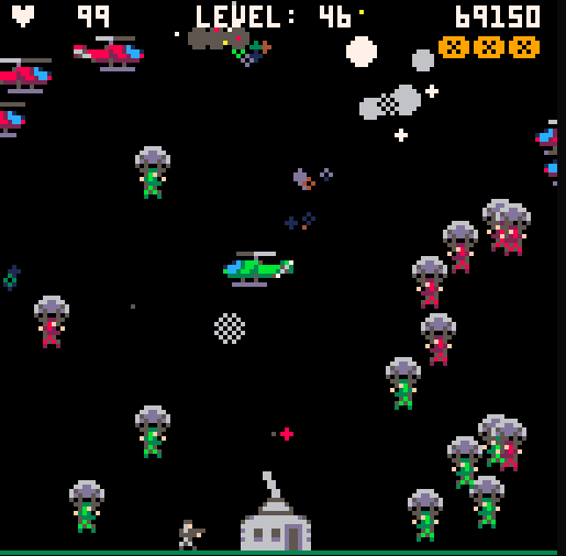 Picotage is a retro-style action game where you defend your base against waves of helicopters dropping paratroopers. The goal is simple: survive as long as you can. Shoot the helicopters before they drop soldiers, take out the parachutes mid-air, or eliminate the soldiers before they land and start firing at your base.